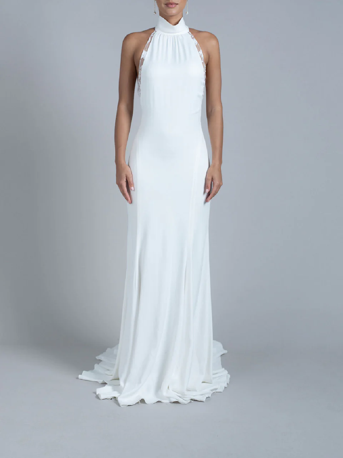 Col montant et dos nu. La robe Queen est confectionnée en crêpe avec de la dentelle fleurie